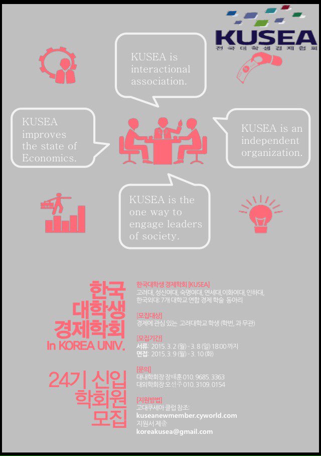 ¾È³çÇϼ¼¿ä? °í´ë À¯ÀÏÀÇ °æÁ¦ÇÐȸ kusea ¿¡¼ 2015³â 1Çб⸦ ÇÔ²²ÇÒ ½ÅÀÔ ÇÐȸ¿øµéÀ» ¸ðÁýÇϰí ÀÖ½À´Ï´Ù.
