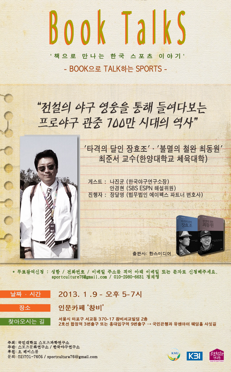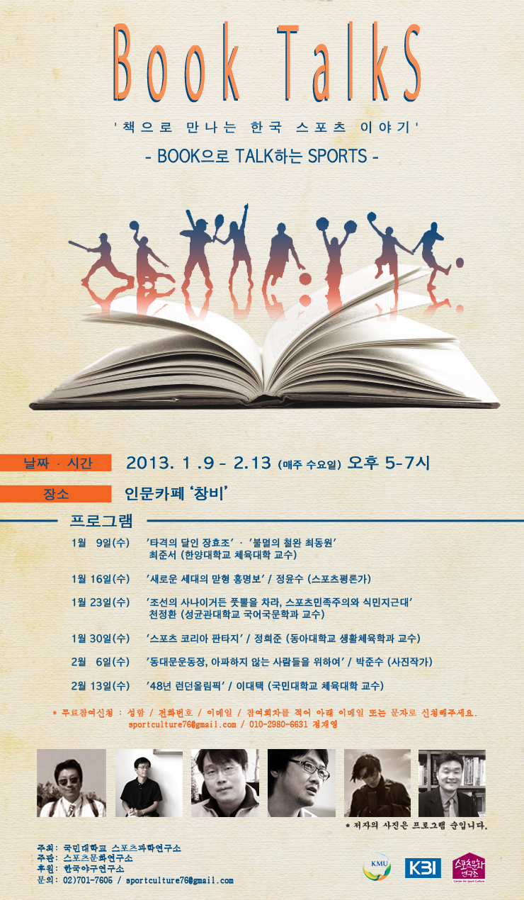 ±¹¹Î´ëÇб³ ½ºÆ÷Ã÷°úÇבּ¸¼Ò ÁÖÃÖ, ½ºÆ÷Ã÷¹®È¿¬±¸¼Ò, Çѱ¹¾ß±¸¿¬±¸¼Ò °øµ¿ÁÖ°ü, ¿Àº£À̽ºº¼ ÈÄ¿øÀ¸·Î ÁøÇàµÇ´Â Book TalkS´Â ½ºÆ÷Ã÷¿¡ ´ëÇÑ ¿ì¸®ÀÇ '±â¾ï'°ú 'Ãß¾ï'À» µÇ»ì¸®°í, ±×°ÍÀÇ ¿ª»çÀûÀÎ °¡Ä¡¸¦ µÇ»õ°Üº¸´Â ÀÚ¸®ÀÔ´Ï´Ù.