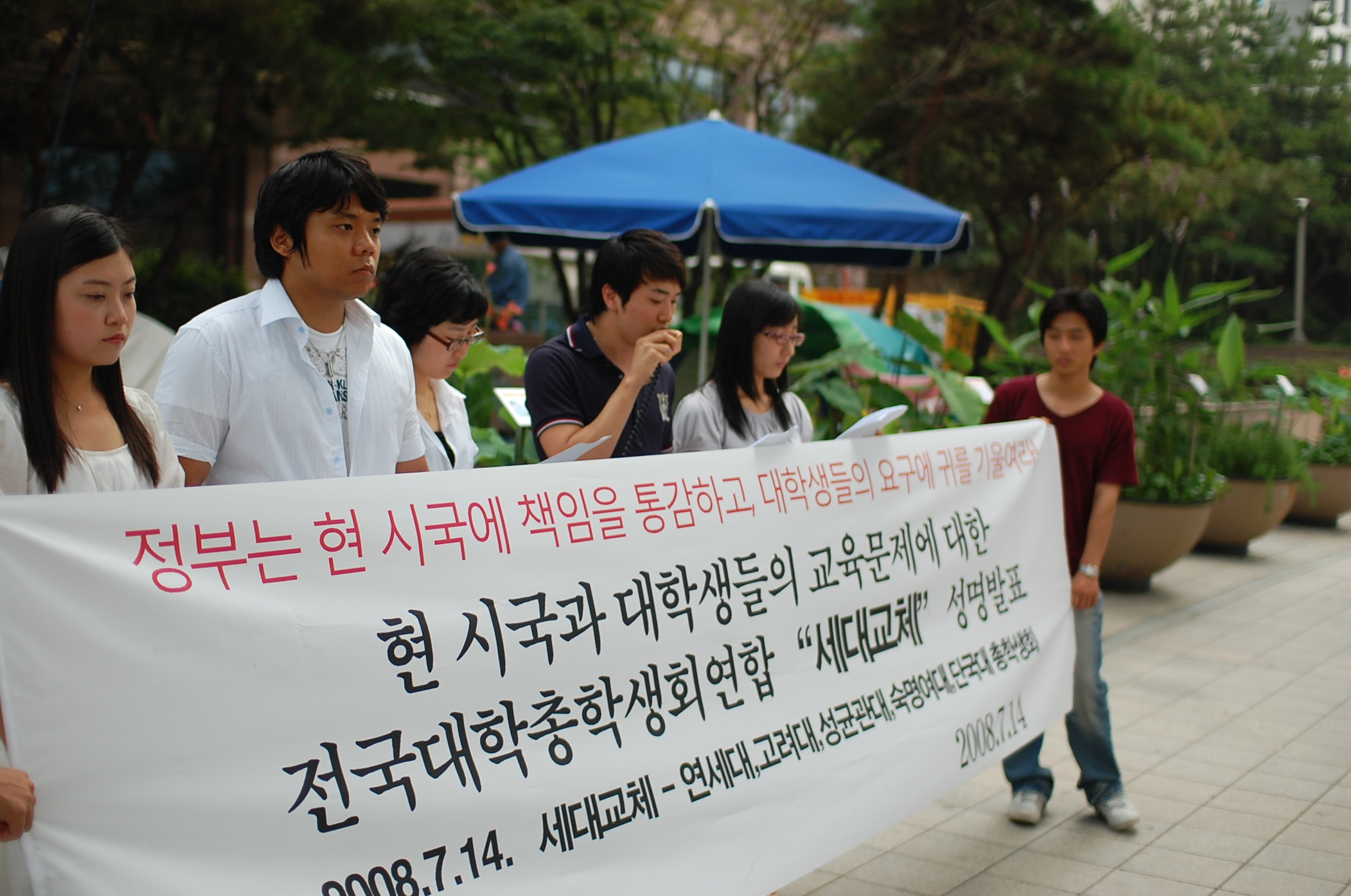 ¿À´Ã ¿ÀÀü 11½Ã, ´ëÇб³ ÃÑÇлýȸ ¿¬ÇÕÀÎ ¼¼´ë±³Ã¼´Â ±¹È¸ ¾Õ¿¡¼ ¼±¾ð¹®À» ³¶µ¶Çß´Ù. ¼±¾ð¹®¿¡¼ ¼¼´ë±³Ã¼´Â Á¤ºÎ°¡ ¼è°í±â